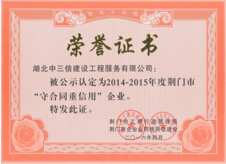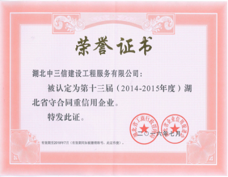 2016年7月,湖北中三信建設(shè)工程服務(wù)有限公司分別榮獲湖北省、荊門市第十三屆“守合同、重信用”榮譽(yù)稱號(hào)。