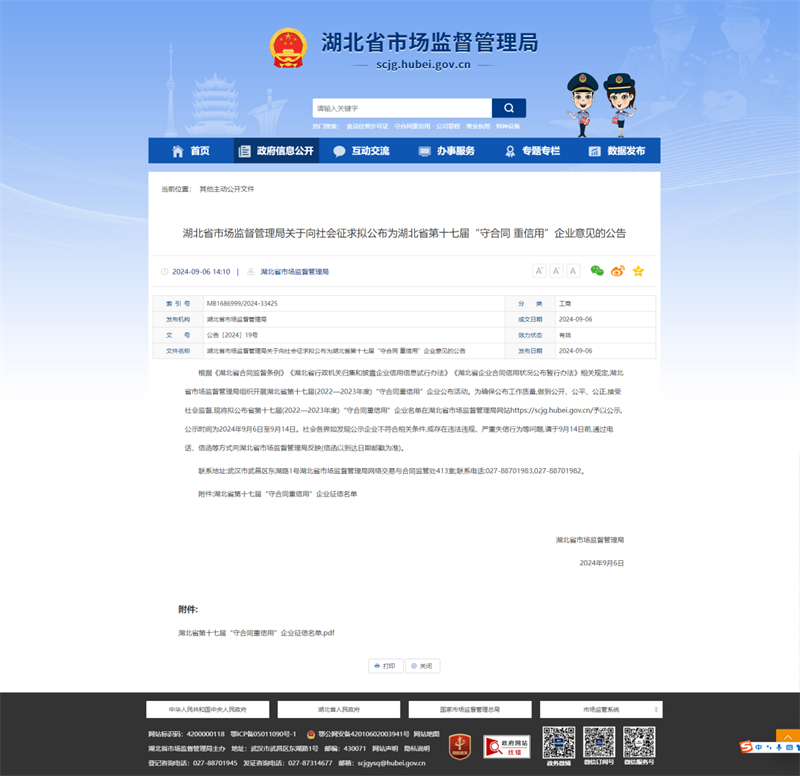 湖北省市場(chǎng)監(jiān)督管理局關(guān)于向社會(huì)征求擬公布為湖北省第十七屆“守合同 重信用”企業(yè)意見(jiàn)的公告